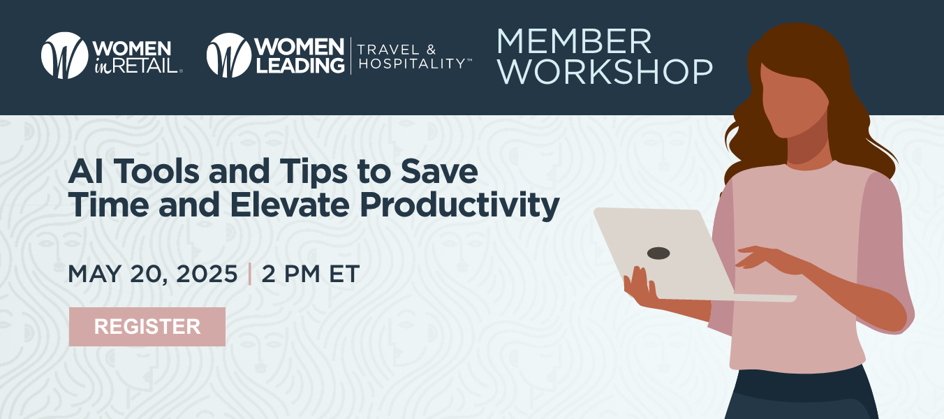 Join us Tuesday, May 20 at 2:00 p.m. ET for a hands-on virtual workshop with Women Leading Travel & Hospitality members as well as members of our sister organization, Women in Retail Leadership Circle. The workshop, AI Tools and Tips to Save Time and Elevate Productivity, will offer valuable insights that will help you streamline your day and supercharge your workflow. Register today.